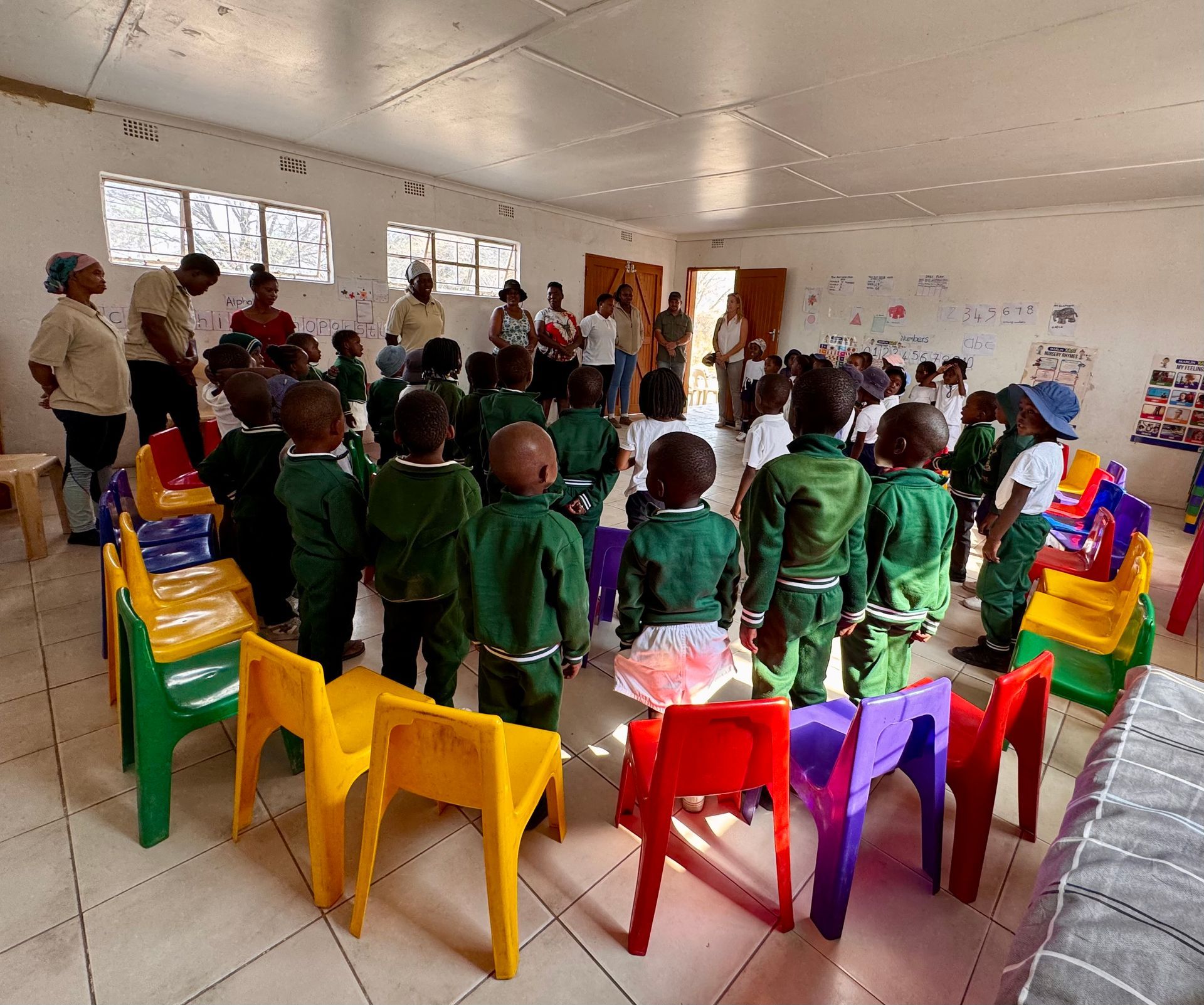 Today the playgroup boasts 13 trained community teachers. It has grown from 30 children to more than 80. With limited space, the children attend in two rotating groups each day ensuring everyone gets access to a safe, supportive, stimulating environment. The curriculum covers shapes, colours, number-alphabet, days of the week, and more, all designed to build foundational skills and confidence before the children move into primary school.